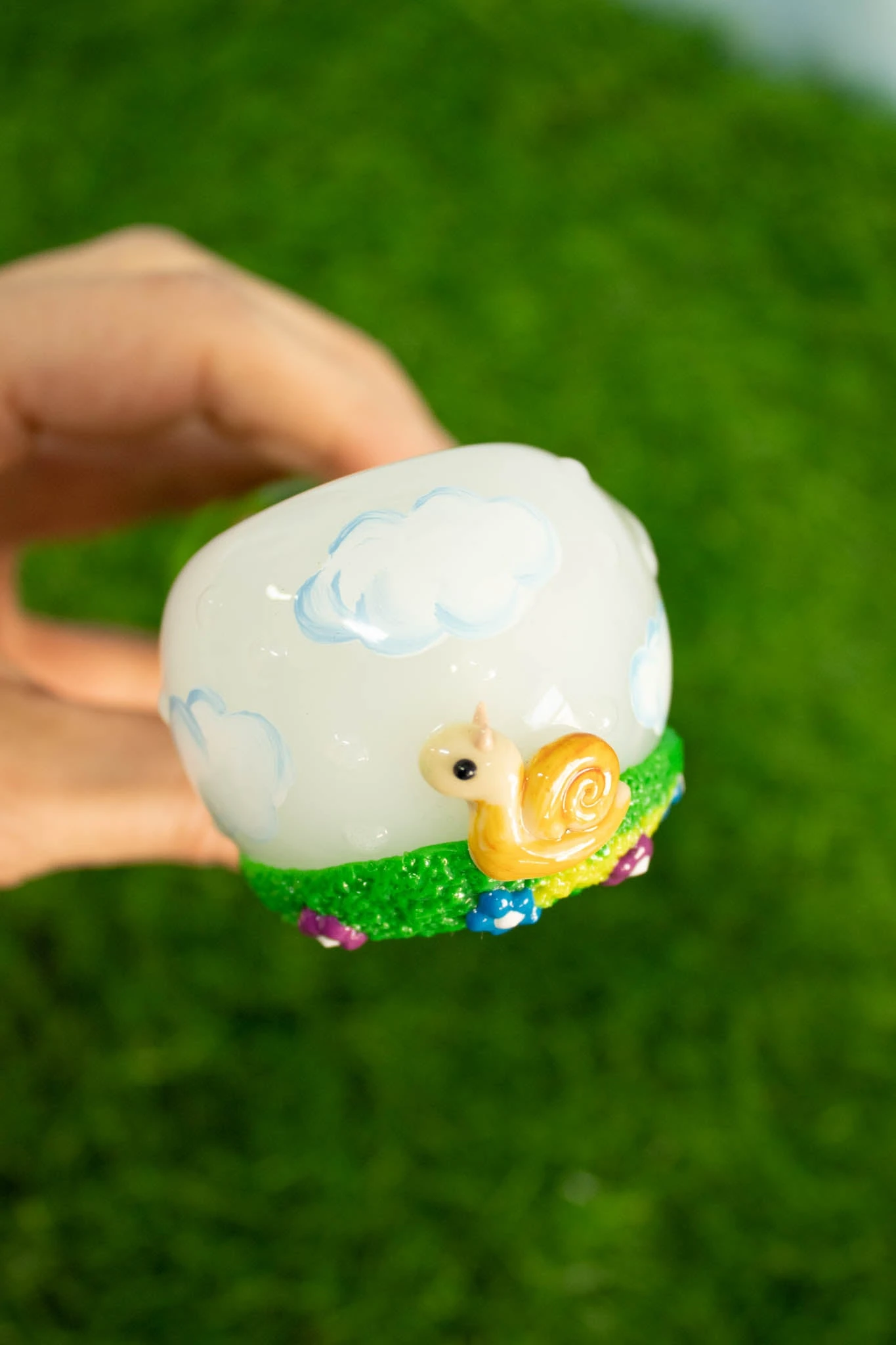 - Featuring a kawaii frog sitting on lilypads on the handle and an adorable snail in a cottage core field on the back head of the pipe