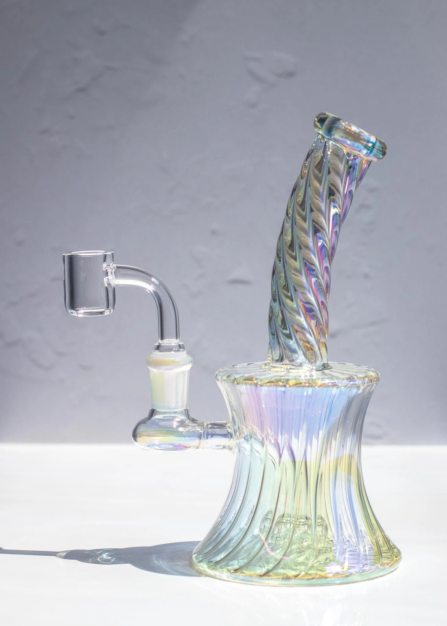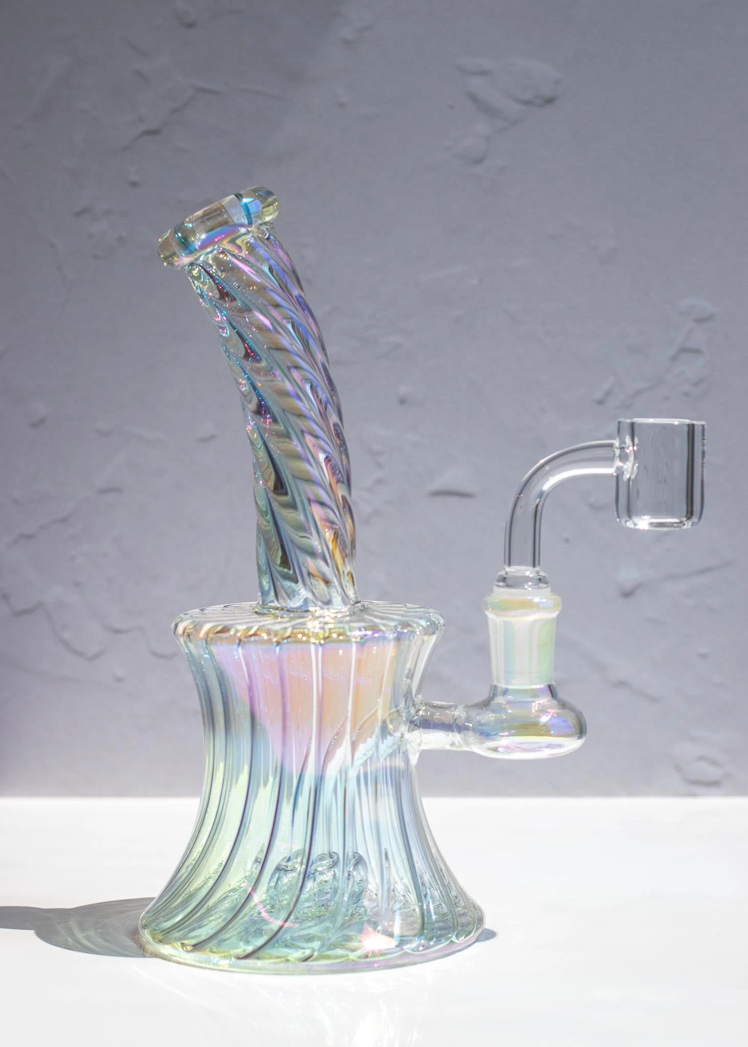 - This rig features swirled glass with an iridescent finish that allows the swirls to catch the light and reflect all the colors of the rainbow