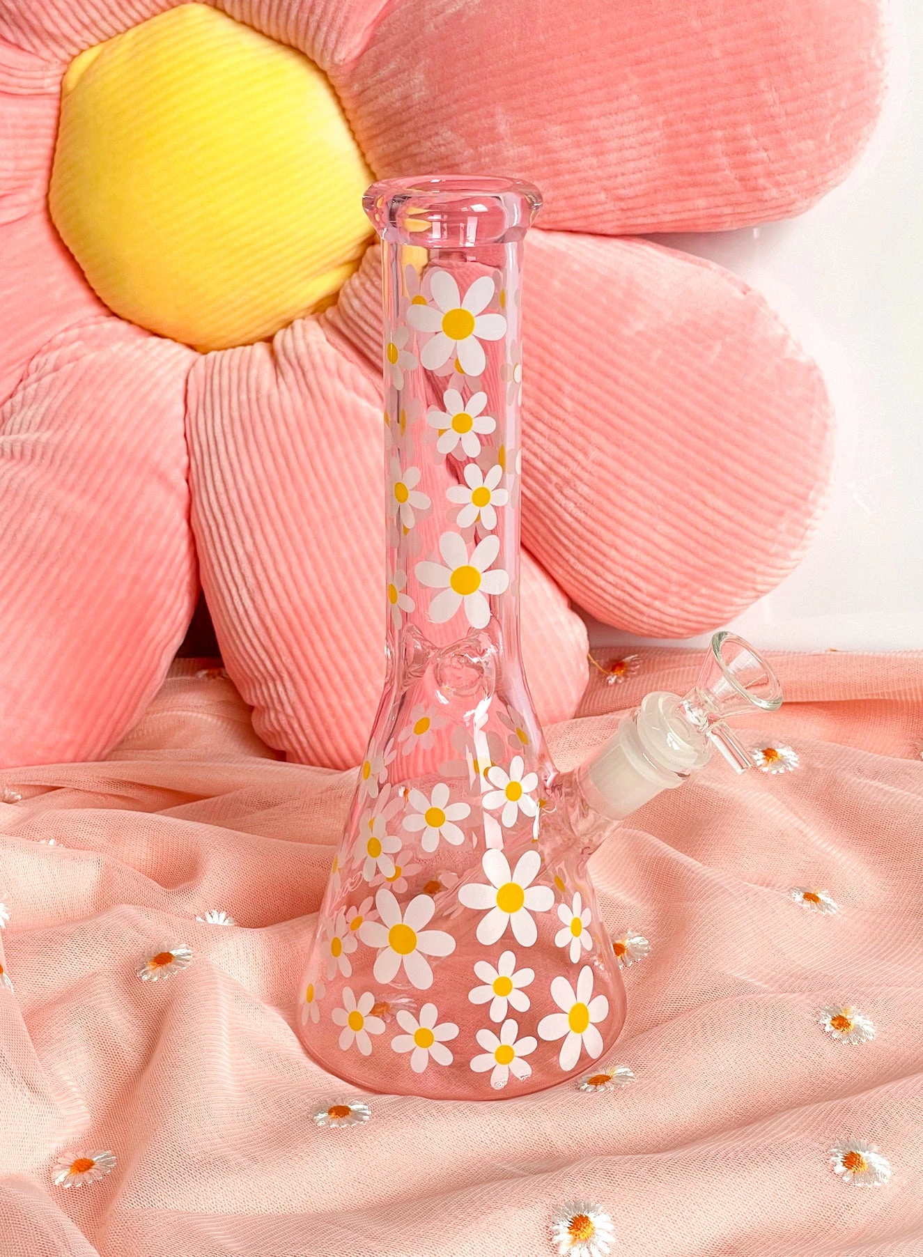 - This bong is made of pink glass and finished with white & yellow daisy patterns