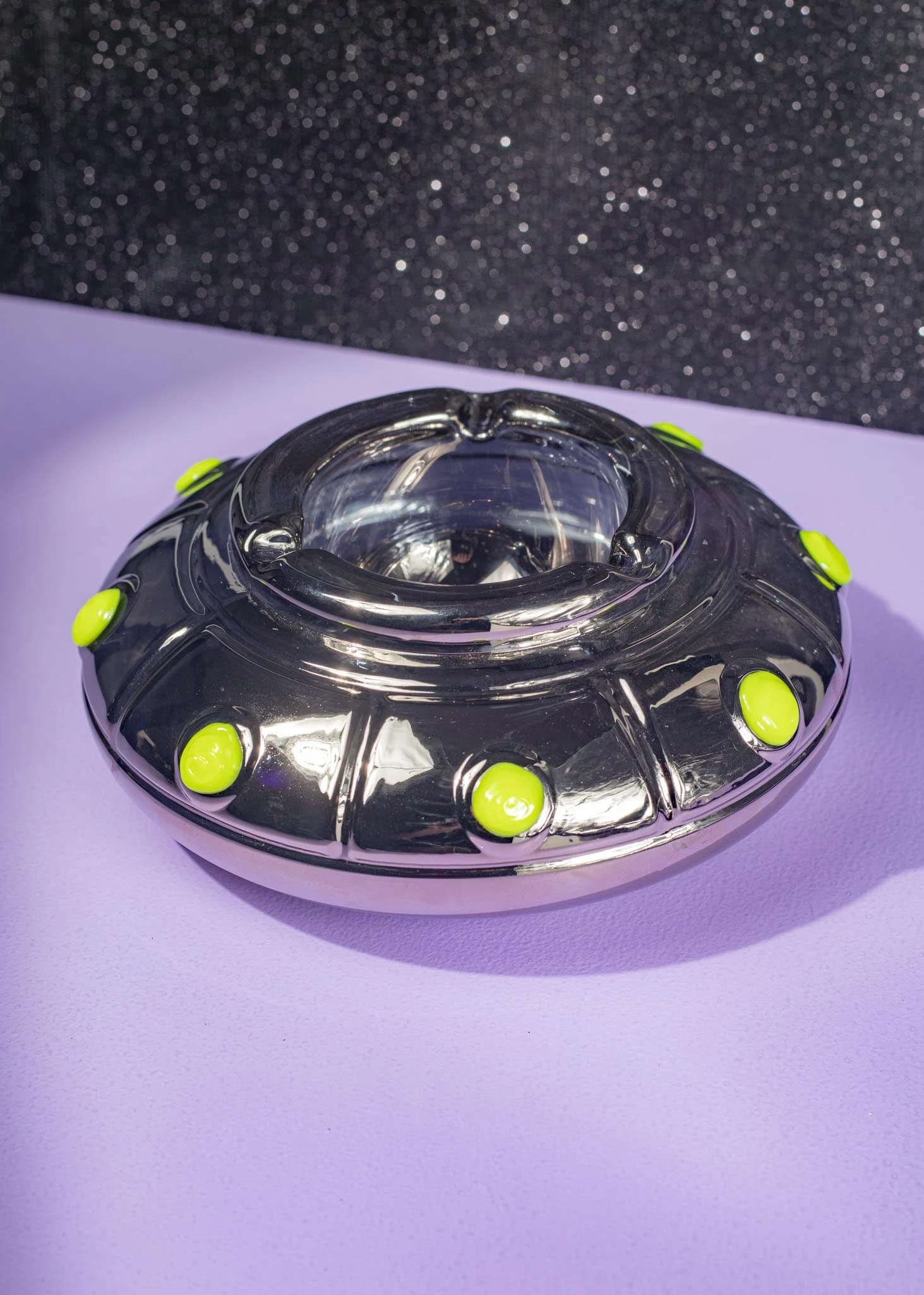 This large UFO shaped ashtray with glow-in-the-dark accents is sure to be a conversation piece at your next sesh